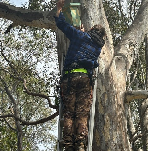 On Friday the 1st of December 2023 Travis and Elise Davies from Underline Tree Clearing, with the assistance of Luke Sefton, very generously volunteered their time to assist the VM students in installing the nesting boxes at Whiteheads Creek in Seymour (on Goulburn Valley Water’s pump sites and private land). The boxes will be tracked and monitored by both VM students and Seymour Urban Landcare to see if they are being used.